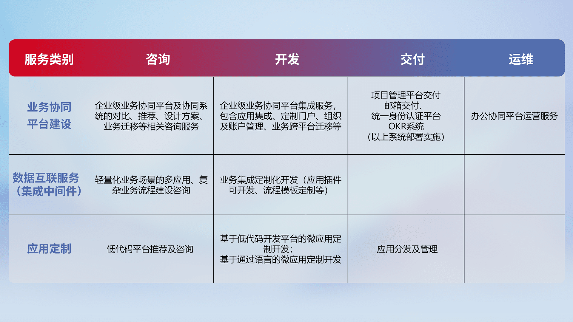 针对钉钉、、企微、、IDaas等平台级产品提供产品的规划、、方案、、、、交付、、、、定制化开发等服务,,实现如统一协同办公、、、智能客户服务、、、混合会议管理、、、、智能数据查询、、、等业务场景,,,实现数字化转型。。。。